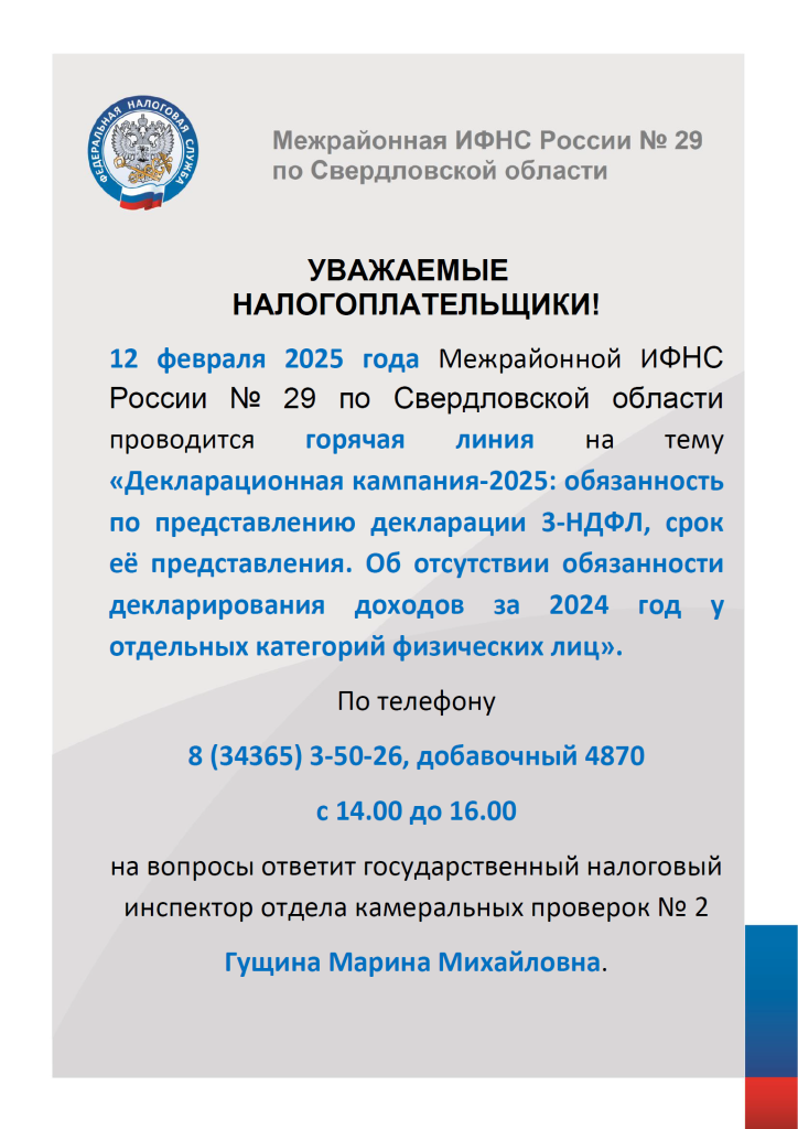 12 февраля 2025 года Межрайонной ИФНС России № 29 по Свердловской области проводится горячая линия на тему «Декларационная кампания-2025: обязанность по представлению декларации 3-НДФЛ, срок её представления. Об отсутствии обязанности декларирования...