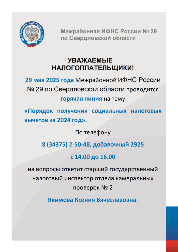 29 мая 2025 года проводится горячая линия на тему «Порядок получения социальных налоговых вычетов за 2024 год»