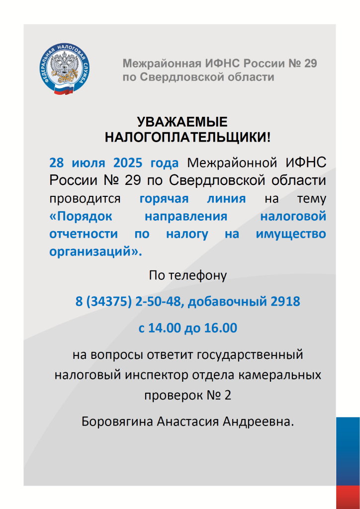28 июля 2025 года проводится горячая линия на тему «Порядок направления налоговой отчетности по налогу на имущество организаций»