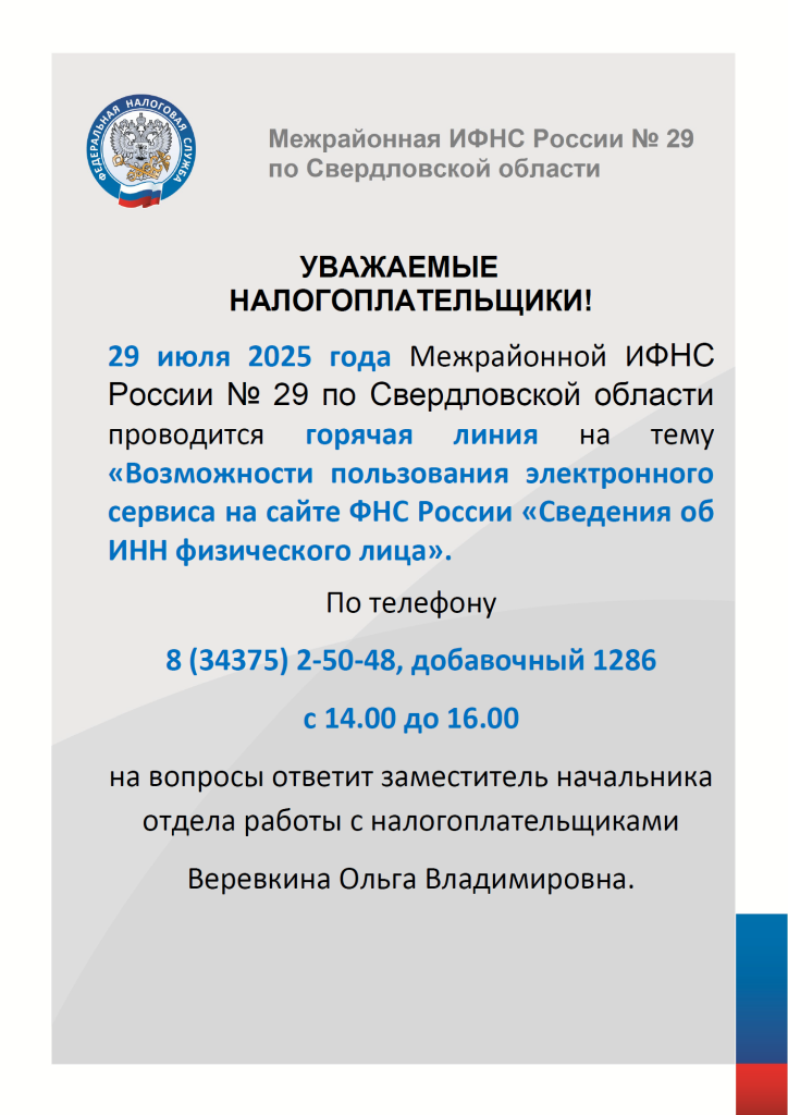 29 июля 2025 года проводится горячая линия на тему «Возможности пользования электронного сервиса на сайте ФНС России «Сведения об ИНН физического лица»