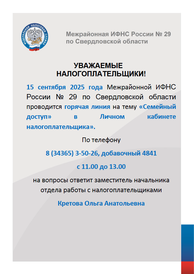 15 сентября 2025 года Межрайонной ИФНС проводится горячая линия на тему «Семейный доступ» в Личном кабинете налогоплательщика»