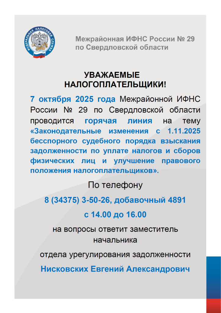 7 октября 2025 года Межрайонной ИФНС проводится горячая линия на тему «Законодательные изменения с 1.11.2025 бесспорного судебного порядка взыскания задолженности по уплате налогов и сборов физических лиц и улучшение правового положения налогоплательщиков
