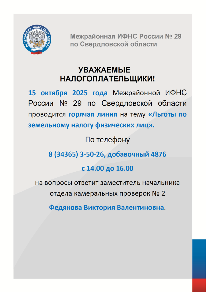 15 октября 2025 года Межрайонной ИФНС проводится горячая линия на тему «Льготы по земельному налогу физических лиц»