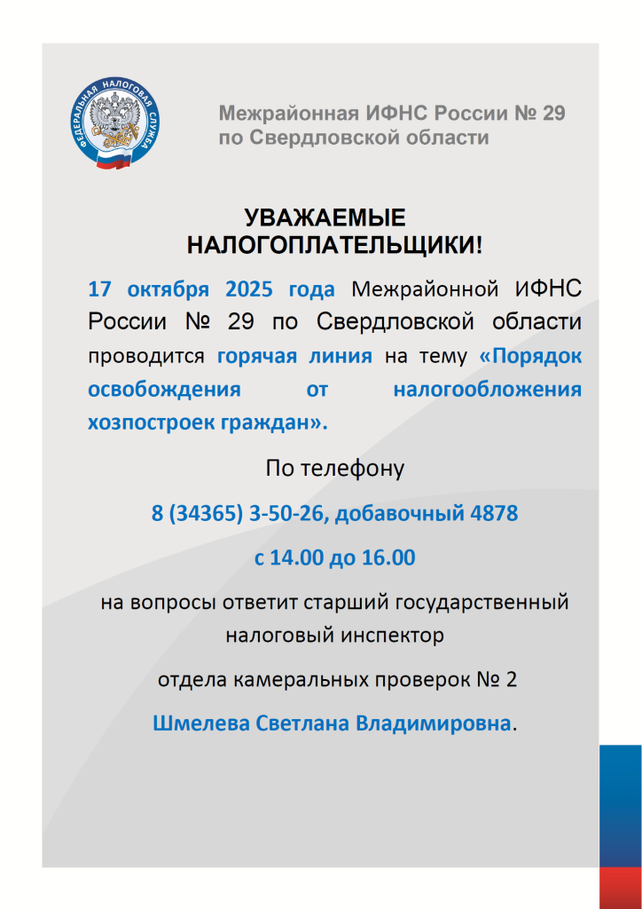 17 октября 2025 года Межрайонной ИФНС проводится горячая линия на тему «Порядок освобождения от налогообложения хозпостроек граждан»