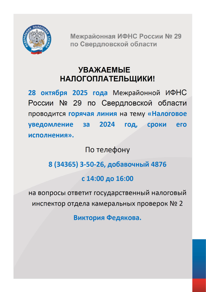 28 октября 2025 года Межрайонной ИФНС проводится горячая линия на тему «Налоговое уведомление за 2024 год, сроки его исполнения»