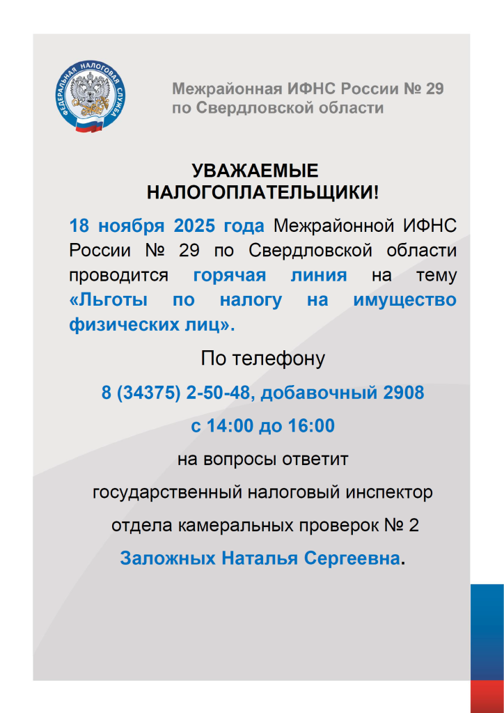 18 ноября 2025 года Межрайонной ИФНС России № 29 проводится горячая линия на тему «Льготы по налогу на имущество физических лиц»