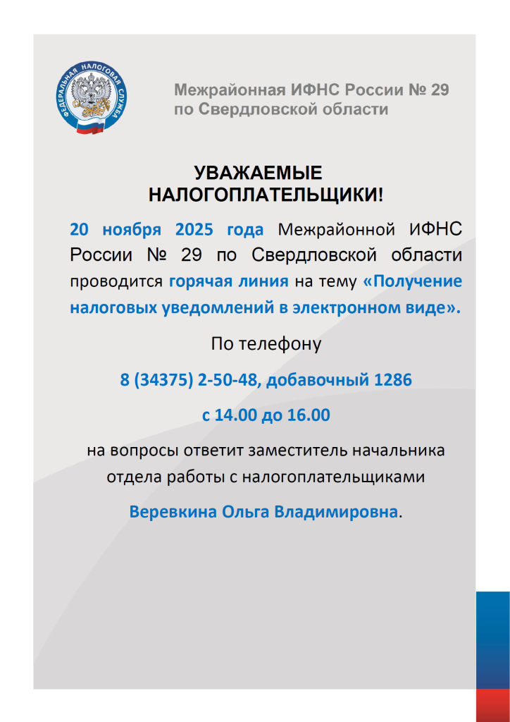 20 ноября 2025 года Межрайонной ИФНС России № 29 проводится горячая линия на тему «Получение налоговых уведомлений в электронном виде»