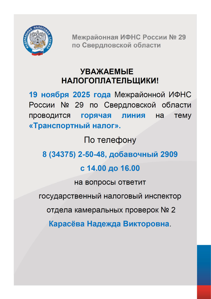 19 ноября 2025 года Межрайонной ИФНС России № 29 проводится горячая линия на тему «Транспортный налог»