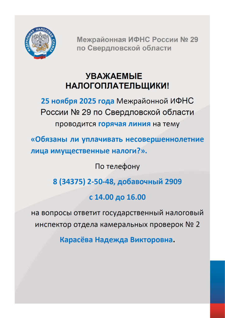 25 ноября 2025 года Межрайонной ИФНС России № 29 по Свердловской области проводится горячая линия на тему «Обязаны ли уплачивать несовершеннолетние лица имущественные налоги?»