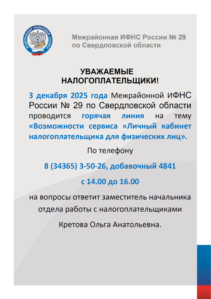 3 декабря 2025 года Межрайонной ИФНС России № 29 по Свердловской области проводится горячая линия на тему «Возможности сервиса «Личный кабинет налогоплательщика для физических лиц»