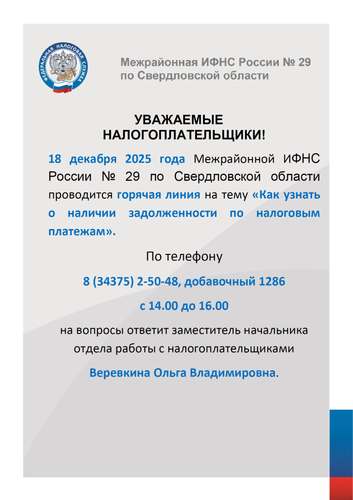 18 декабря 2025 года Межрайонной ИФНС России № 29 по Свердловской области проводится горячая линия на тему «Как узнать о наличии задолженности по налоговым платежам»