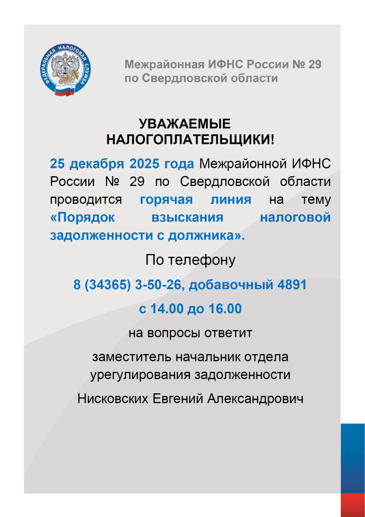25 декабря 2025 года Межрайонной ИФНС России № 29 по Свердловской области проводится горячая линия на тему «Порядок взыскания налоговой задолженности с должника»