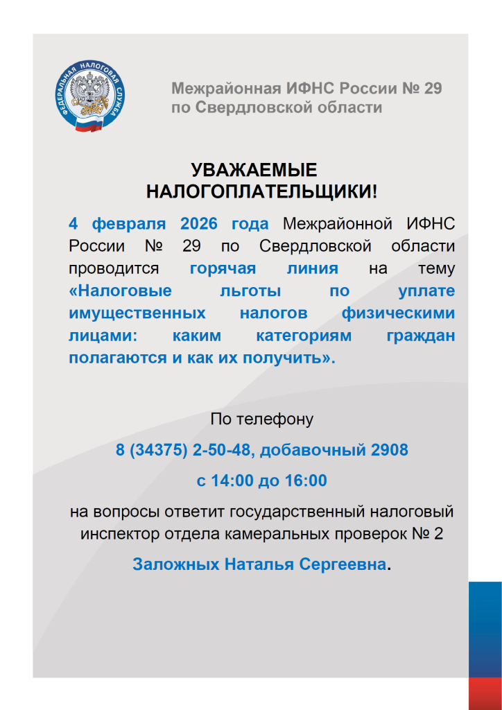 4 февраля 2026 года Межрайонной ИФНС России № 29 проводится горячая линия на тему «Налоговые льготы по уплате имущественных налогов физическими лицами: каким категориям граждан полагаются и как их получить»