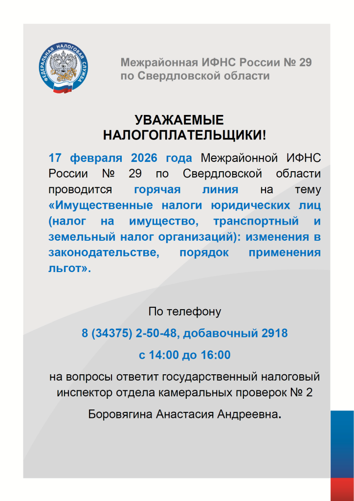 17 февраля 2026 года Межрайонной ИФНС России № 29 проводится горячая линия на тему «Имущественные налоги юридических лиц (налог на имущество, транспортный и земельный налог организаций): изменения в законодательстве, порядок применения льгот»