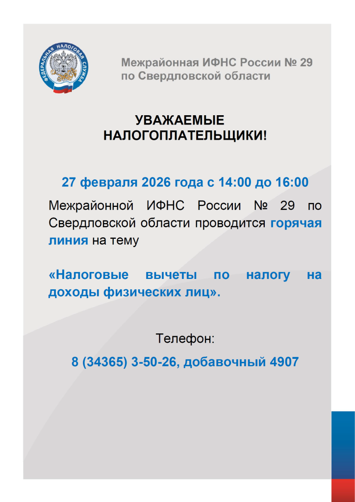 27 февраля 2026 года с 14:00 до 16:00 Межрайонной ИФНС России № 29 проводится горячая линия на тему «Налоговые вычеты по налогу на доходы физических лиц»