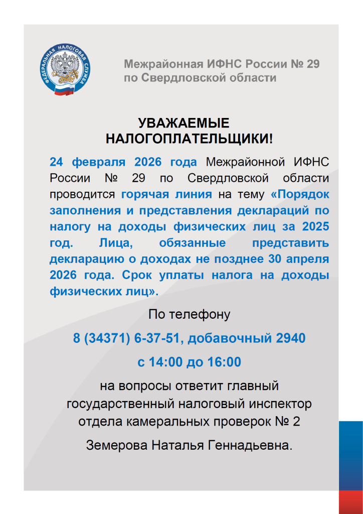 24 февраля 2026 года Межрайонной ИФНС России № 29 проводится горячая линия на тему «Порядок заполнения и представления деклараций по налогу на доходы физических лиц за 2025 год. Лица, обязанные представить декларацию о доходах не позднее 30 апреля 2026...