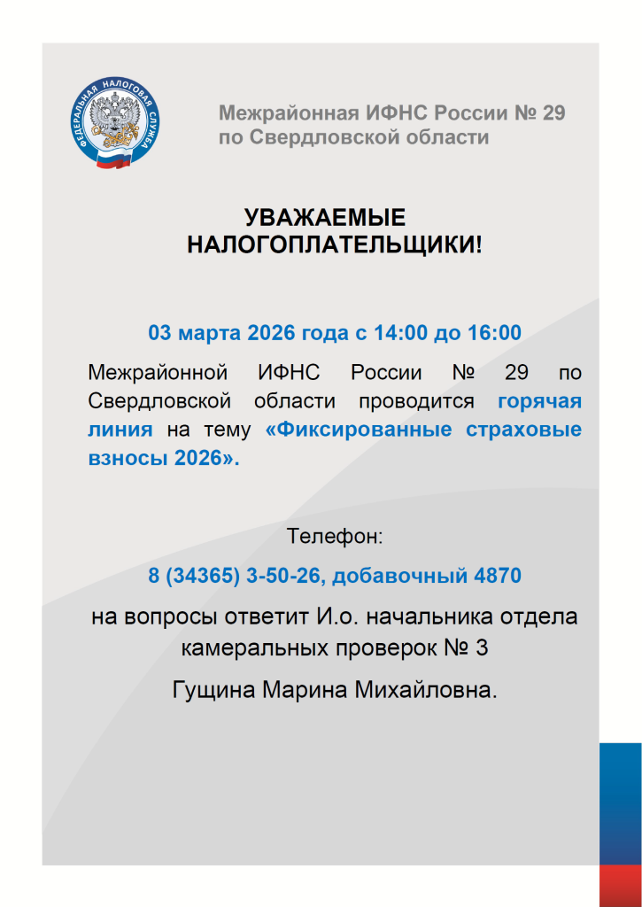 03 марта 2026 года с 14:00 до 16:00 Межрайонной ИФНС России № 29 проводится горячая линия на тему «Фиксированные страховые взносы 2026»