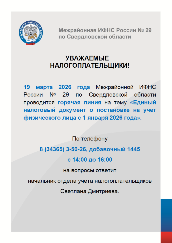 19 марта 2026 года Межрайонной ИФНС России № 29 по Свердловской области проводится горячая линия на тему «Единый налоговый документ о постановке на учет физического лица с 1 января 2026 года»