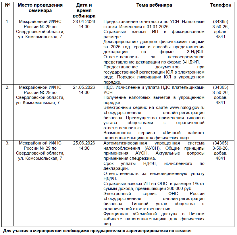 График проведения Межрайонной ИФНС России № 29 по Свердловской области тематических семинаров/вебинаров с налогоплательщиками в 2 квартале 2026 года