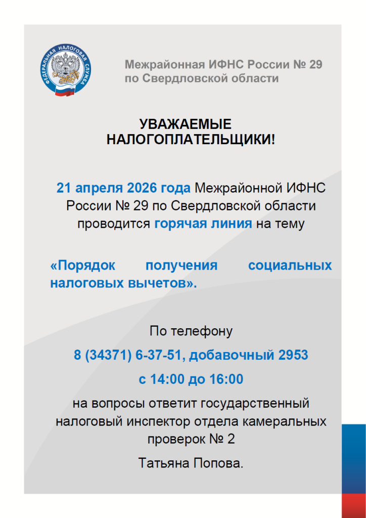 21 апреля 2026 года Межрайонной ИФНС России № 29 по Свердловской области проводится горячая линия на тему «Порядок получения социальных налоговых вычетов»