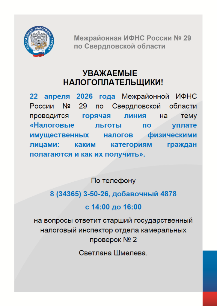 22 апреля 2026 года Межрайонной ИФНС России № 29 по Свердловской области проводится горячая линия на тему «Налоговые льготы по уплате имущественных налогов физическими лицами: каким категориям граждан полагаются и как их получить»