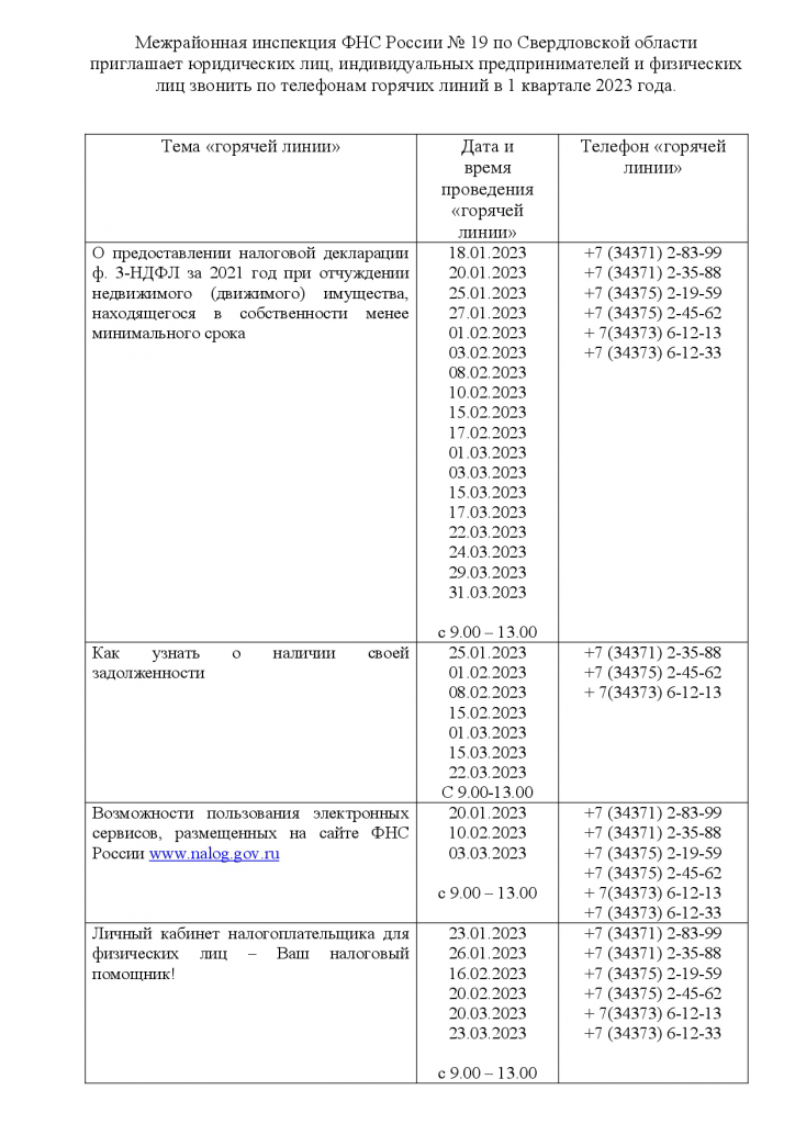 Межрайонная инспекция ФНС России № 19 по Свердловской области приглашает юридических лиц, индивидуальных предпринимателей и физических лиц звонить по телефонам горячих линий в 1 квартале 2023 года