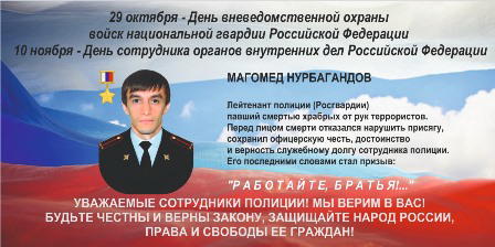 Как сообщил глава пресс-службы ГУ МВД России по Свердловской области Валерий Горелых, в рамках мероприятий планируется проведение флеш-моба «Работайте, братья!» с использованием образа сотрудника Росгвардии Героя Российской Федерации лейтенанта полиции Магомеда Нурбагандова, до конца оставшегося верным служебному долгу и героически погибшего в борьбе с террористами в Дагестане в 2016 году.