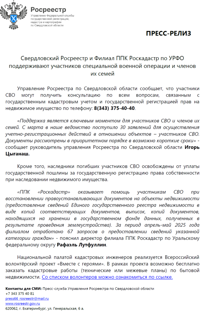 Свердловский Росреестр и Филиал ППК Роскадастр по УРФО поддерживают участников специальной военной операции и членов их семей