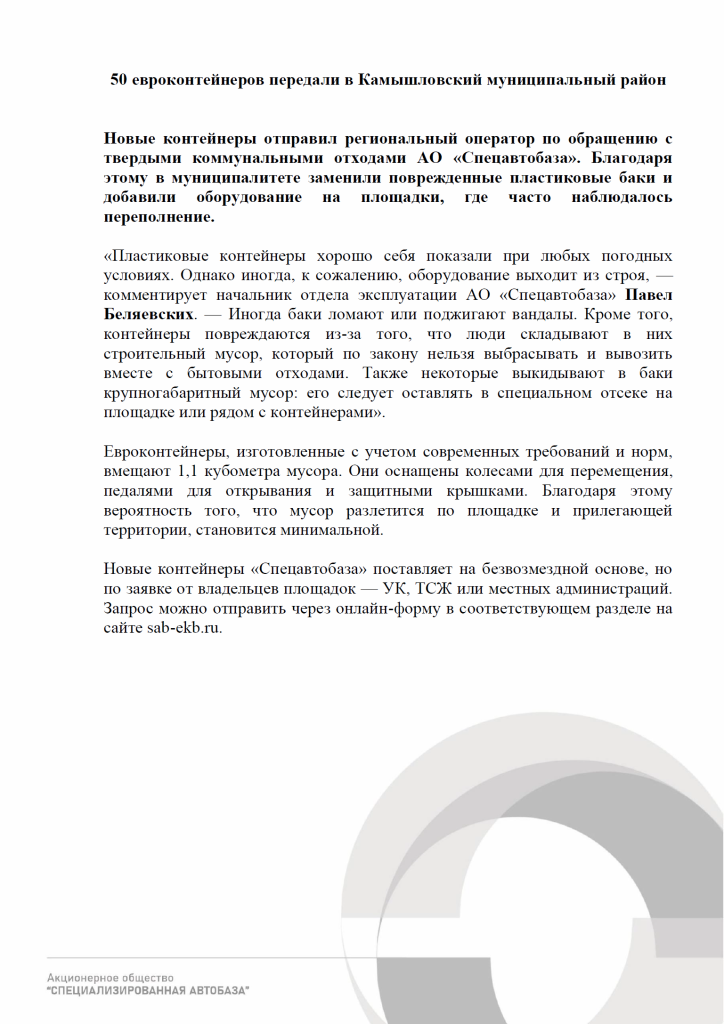 50 евроконтейнеров передали в Камышловский муниципальный район