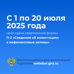 С 1 по 20 июля 2025 года необходимо направить квартальную форму федерального статистического наблюдения № П-2 «Сведения об инвестициях в нефинансовые активы» через портал http://websbor.gks.ru.