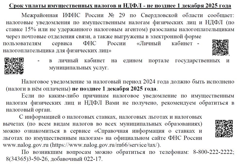 Срок уплаты имущественных налогов и НДФЛ - не позднее 1 декабря 2025 года