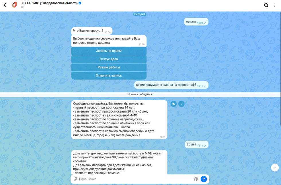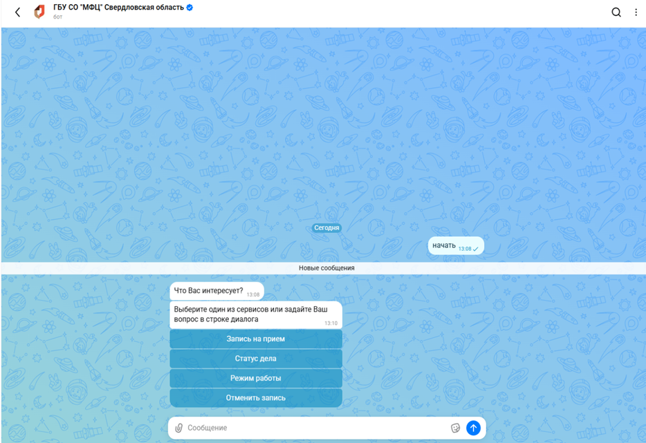 В настоящее время в государственном бюджетном учреждении Свердловской области «Многофункциональный центр предоставления государственных и муниципальных услуг» (далее – ГБУ СО «МФЦ») запущен новый сервис – официальный чат-бот ГБУ СО «МФЦ», разработанный на базе национального мессенджера MAX. Данный сервис значительно упрощает взаимодействие жителей региона с государственным учреждением и обеспечивает удобный доступ к основным сервисам ГБУ СО «МФЦ» круглосуточно.