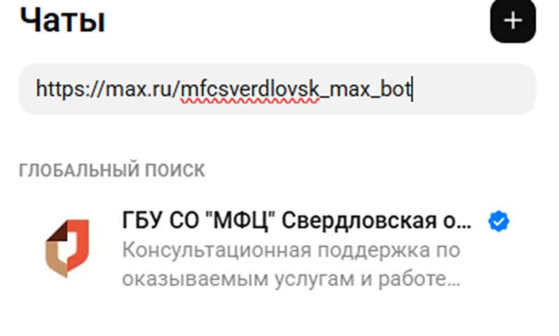 1. Необходимо зайти в приложение и в поисковой строке вставить ссылку на наш чат-бот (https://max.ru/mfcsverdlovsk_max_bot) или написать «ГБУ СО «МФЦ» Свердловской области»
