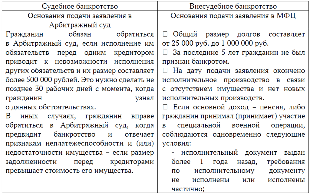 Процедура банкротства может проходить во внесудебном (путем подачи заявления в МФЦ) или в судебном (посредством обращения в суд) порядке.