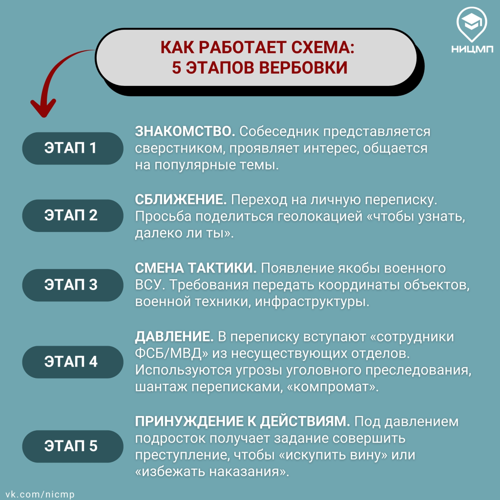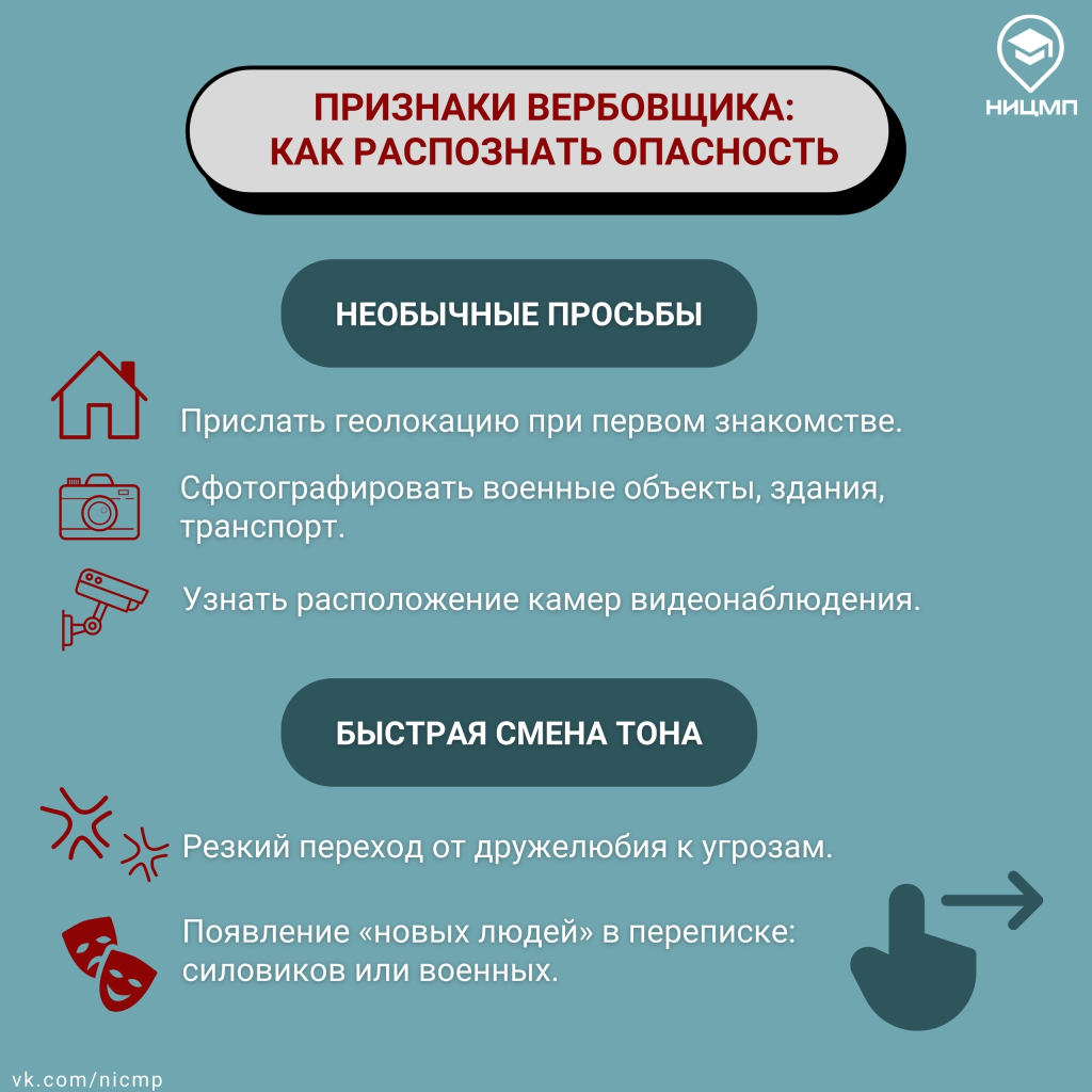 НИЦ Мониторинга и профилактики подготовил информационные карточки - в них наглядно показано, как работают схемы вербовки и как избежать опасности. Изучите их сами и поделитесь с близкими!