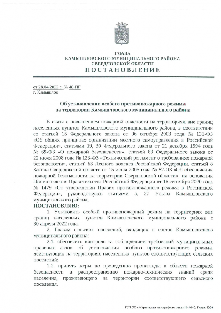 На территории Камышловского муниципального района установлен особый противопожарный режим