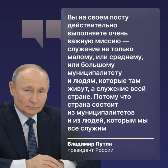 Владимир Путин отметил особую роль муниципального уровня власти в развитии России, подчеркнув, «что страна состоит из муниципалитетов и из людей, которым мы все служим».