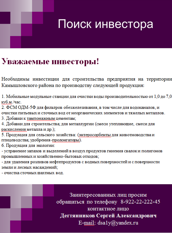 Должностное лицо, ответственное за привлечение инвестиций- заместитель главы Администрации Камышловского муниципального района- Парфенова Наталья Игоревна, телефон для связи: +7 (34375) 2-43-83, e-mail: otdel_ekonomik_adm_kammr@mail.ru