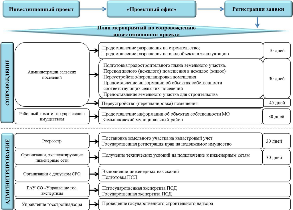 Блок-схема сопровождения инвестиционного проекта в муниципальном образовании Камышловский муниципальный район утверждена Постановление Главы муниципального образования Камышловский муниципальный район №783 от 19.11.2015 «Об утверждении ответственных лиц и Регламента по сопровождению инвестиционных проектов в муниципальном образовании Камышловский муниципальный район»